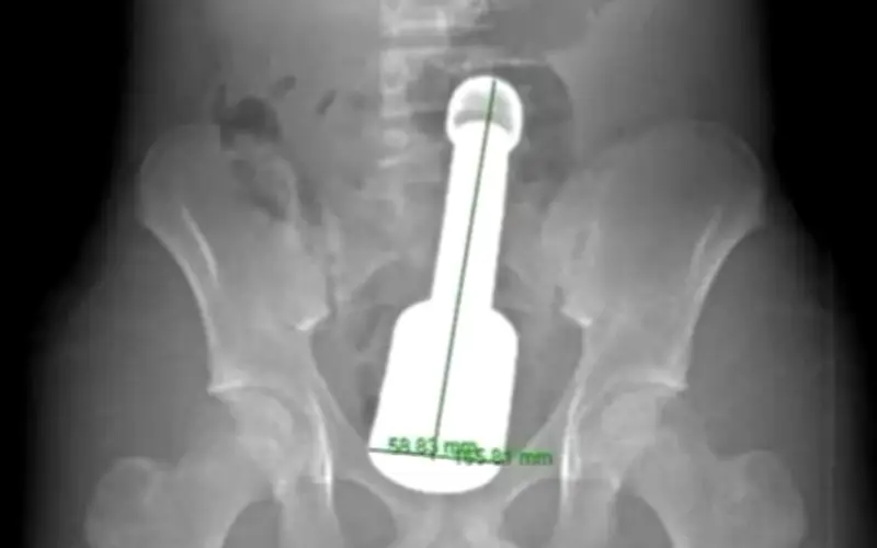 Bệnh nhân nhập viện trong tình trạng đau tức dữ dội vùng hạ vị, khiến các bác sĩ phải nhanh chóng tiến hành thăm khám. Kết quả chẩn đoán hình ảnh sau đó đã phát hiện một dị vật kim loại lớn mắc kẹt sâu trong trực tràng, gây chèn ép nghiêm trọng lên các cơ quan vùng chậu. Đây được xem là tình huống nguy hiểm, có nguy cơ cao dẫn đến các biến chứng nặng nề nếu không được xử trí kịp thời.