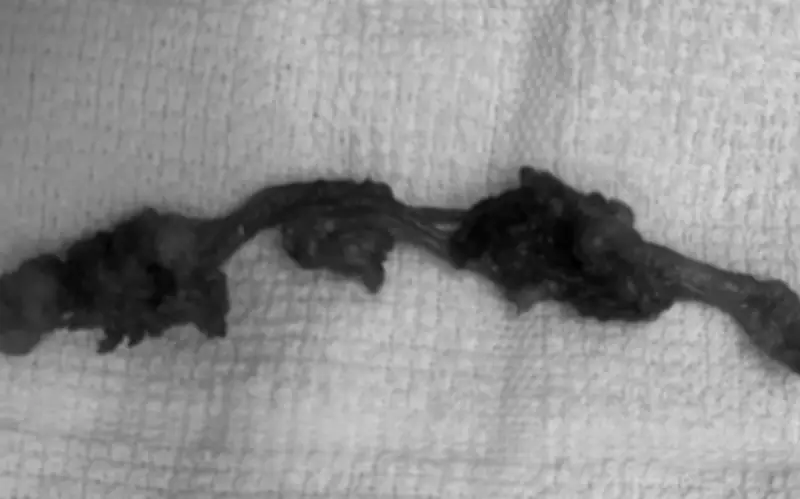 Bệnh nhân được điều trị kháng sinh ngay lập tức tại Khoa Ngoại – Gây mê hồi sức nhằm kiểm soát tình trạng nhiễm trùng. Sau đó, ê kíp phẫu thuật đã tiến hành phẫu thuật nội soi để cắt bỏ dây chằng rốn giữa chứa nang và phần đỉnh bàng quang liên quan. Hình ảnh dây chằng rốn giữa chứa nang niệu rốn đã được lấy ra khỏi cơ thể bệnh nhân một cách an toàn.